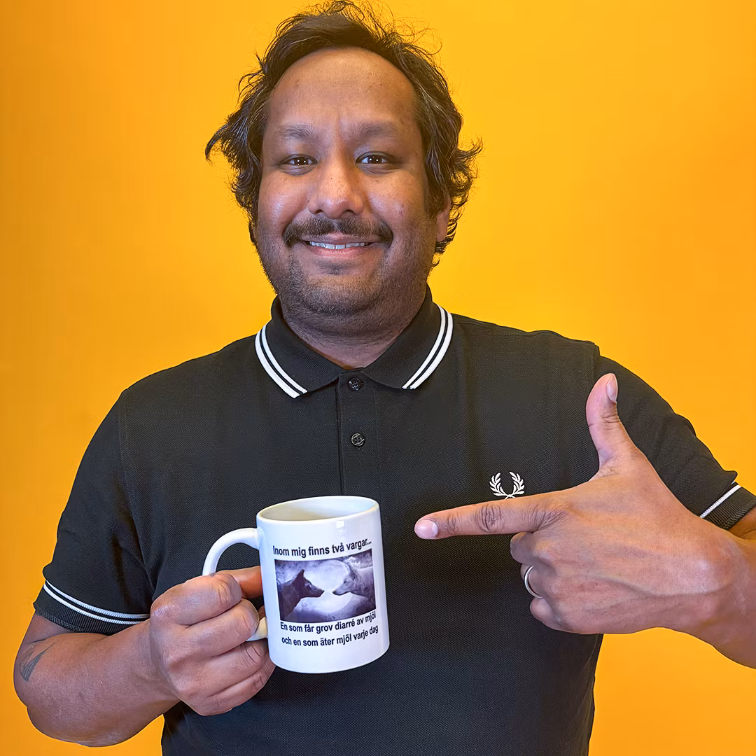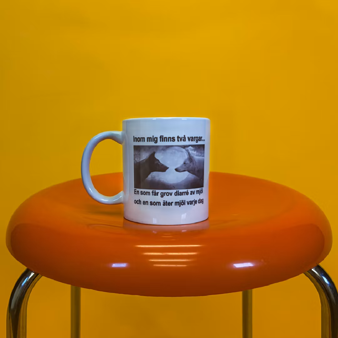 Denna vackra mugg är inspirerad av mjöl, Granis enda naturliga fiende, förutom broar och rep såklart. Med den här muggen är du lika mycket KUNG på kontoret som vid köksbordet. INGET skriker ALFA så mycket som att ha vargar på sin mugg och ett citat från Eskilstunas egen Tony Soprano!
